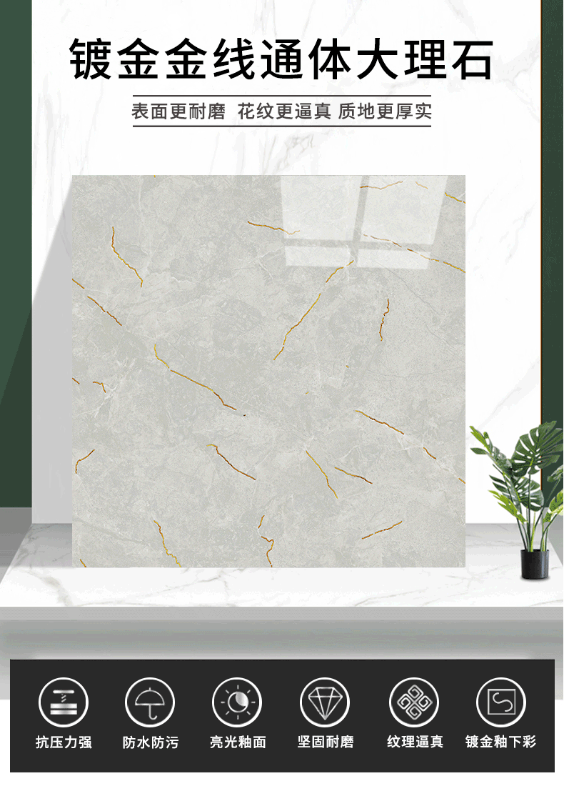 金線金粉 【產(chǎn)品介紹】航天級激光鍍金工藝,鉆石雕刻技術(shù),高溫慢燒,釉層不吸污吸水率低,真空鍍金燒成后再進(jìn)行真空電鍍工藝,平整如鏡面,精拋細(xì)磨,磚面平整光滑細(xì)膩光澤度、亮度、硬度較高。立體紋理,釉下彩工藝,三次淋釉增加磚面的立體感。