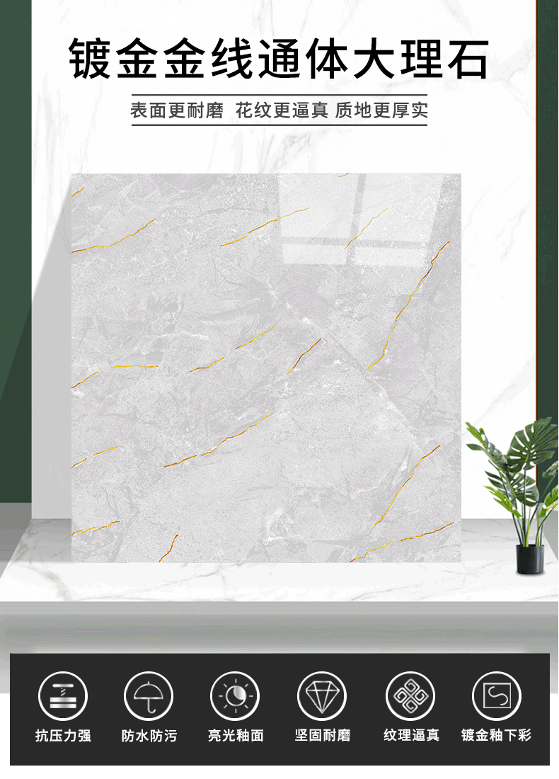 金線金粉 【產品介紹】航天級激光鍍金工藝,鉆石雕刻技術,高溫慢燒,釉層不吸污吸水率低,真空鍍金燒成后再進行真空電鍍工藝,平整如鏡面,精拋細磨,磚面平整光滑細膩光澤度、亮度、硬度較高。立體紋理,釉下彩工藝,三次淋釉增加磚面的立體感。