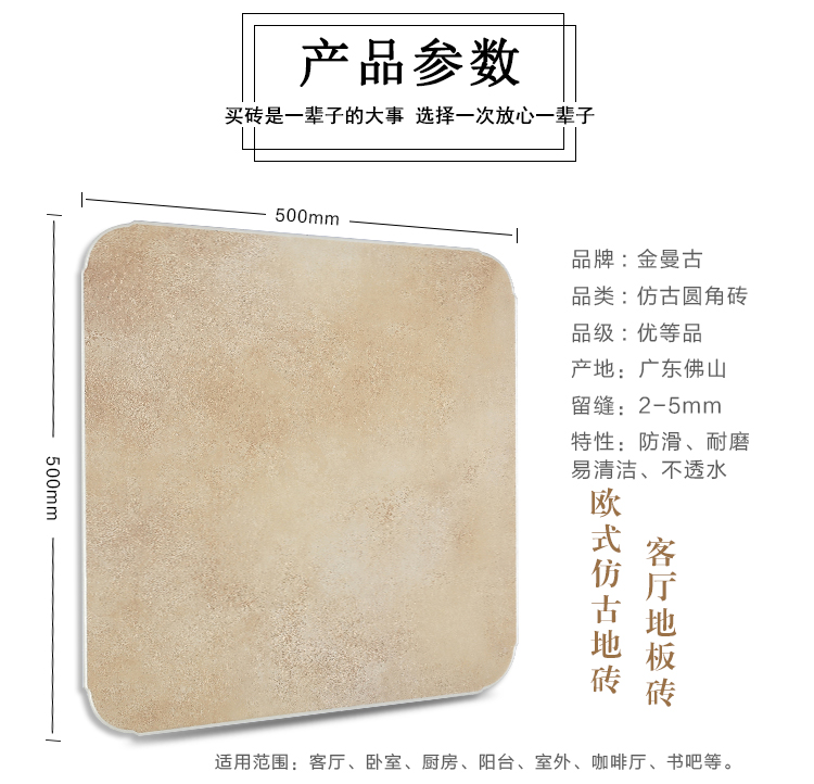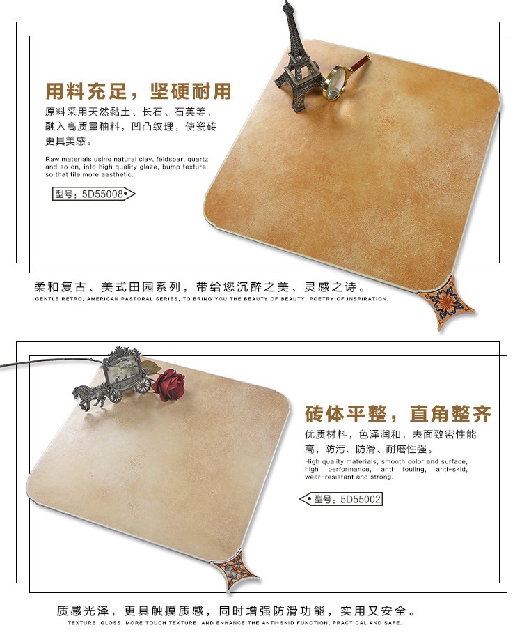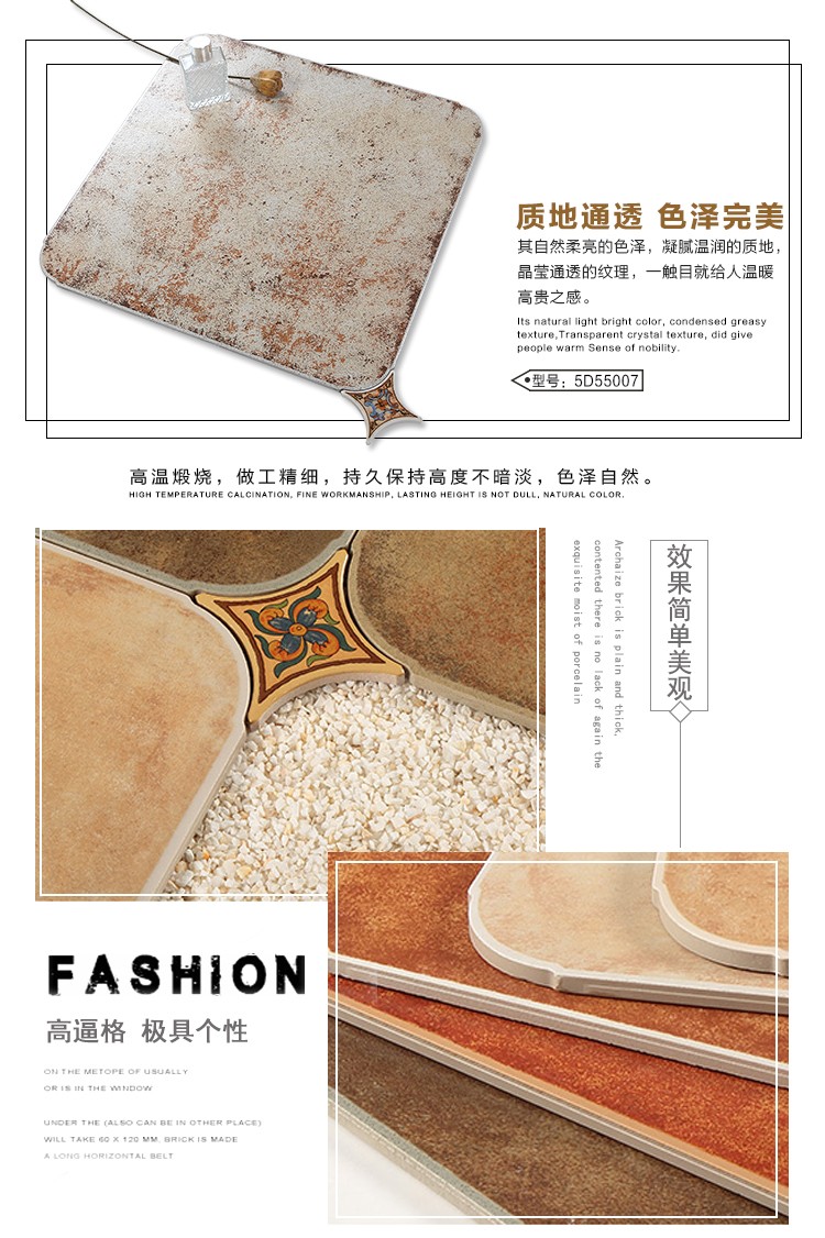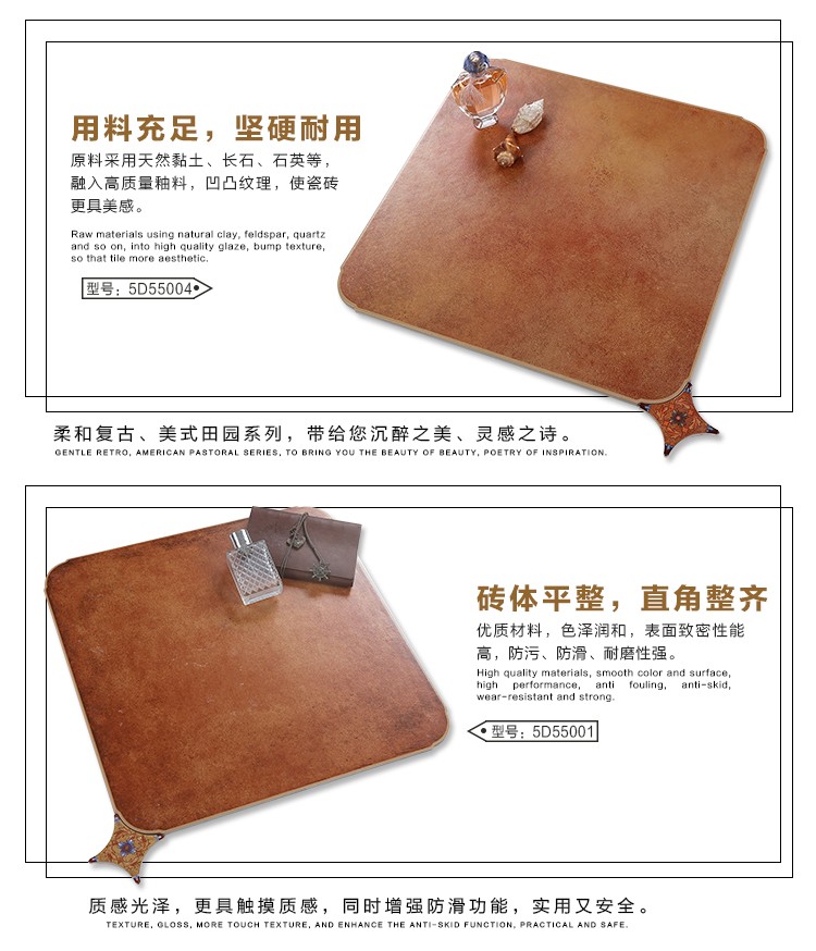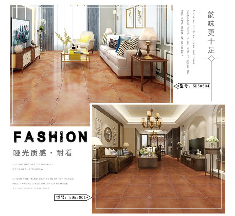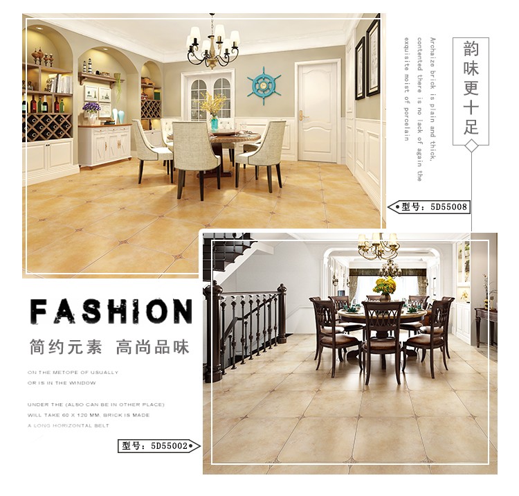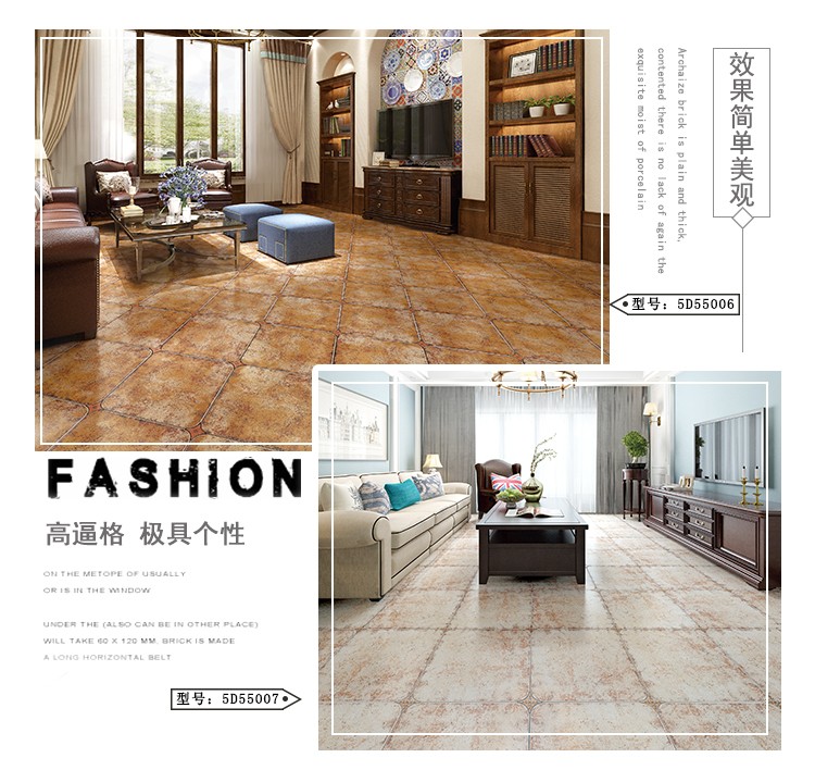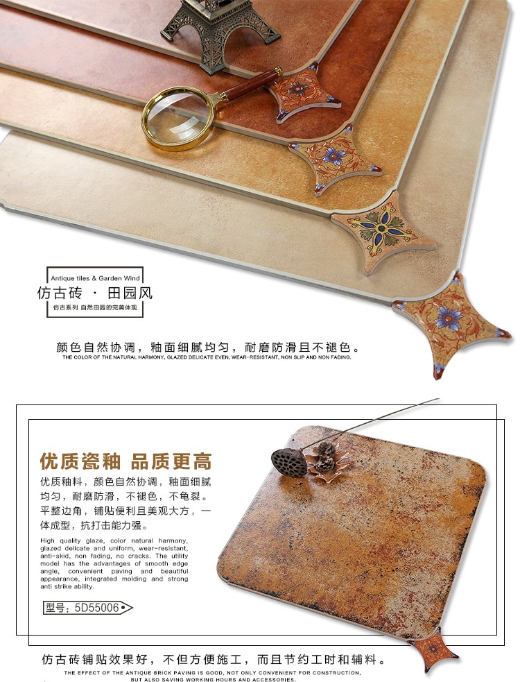 金曼古仿古地磚,采用國際先進(jìn)的超大型壓機(jī)自動(dòng)成型,經(jīng)世界一流的滾筒印花和高溫煅燒而成,通過仿石、仿巖、仿木、仿布、仿金屬等多種表現(xiàn)方式,產(chǎn)品花色圖案新穎時(shí)尚,領(lǐng)先國際潮流,具有超耐磨、防滑、防污等高性能指標(biāo)。