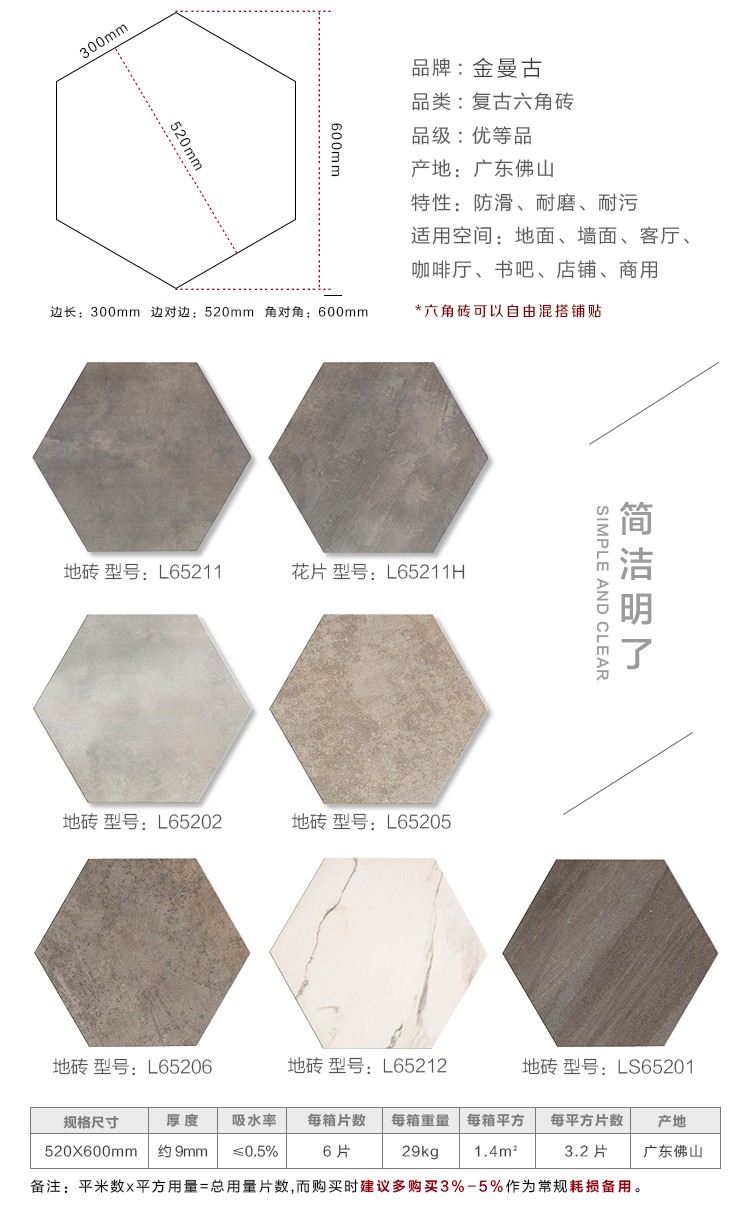 金曼古瓷磚廠家六角磚是一種表面呈現木紋裝飾圖案的環保建材.紋路逼真、自然樸實、沒有木地板褪色、不耐磨等缺點;曼古陶瓷木紋磚系列線條明快,圖案清晰為特色。本身具有阻燃,不腐蝕的特點,綠色、環保型建材;產品使用壽命長,耐磨,無需像木制產品那樣周期性地打蠟保養等。