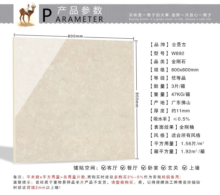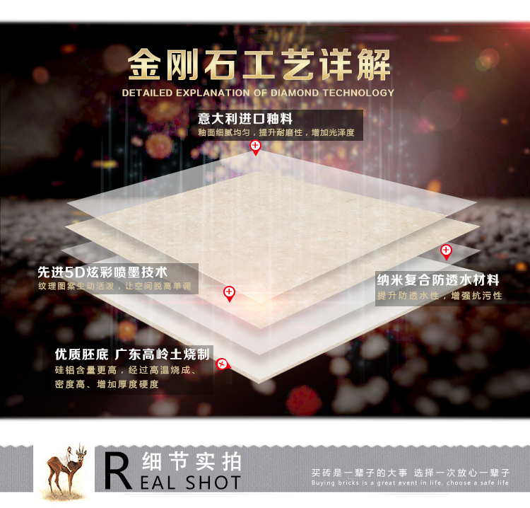 金曼古瓷磚廠家特價金剛石因高品質而得名,是一款極具天然石材效果和微晶石質感的仿石材瓷磚,它不但在價格、環保、耐用和清潔上極具優勢,在質感、規格、花色、重量等指標上,金剛石都遠遠勝于石材、拋光磚。相比其他種類的產品,它最大的特點可以用“高亮度、高耐磨、高平整、高逼真、高清晰、高環保”。