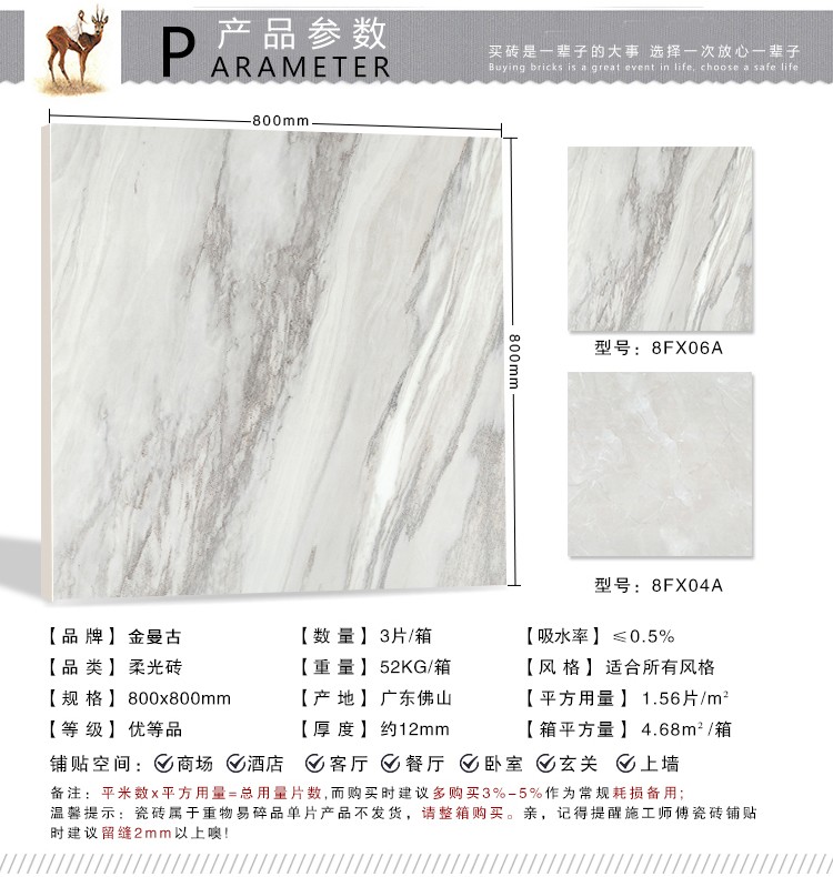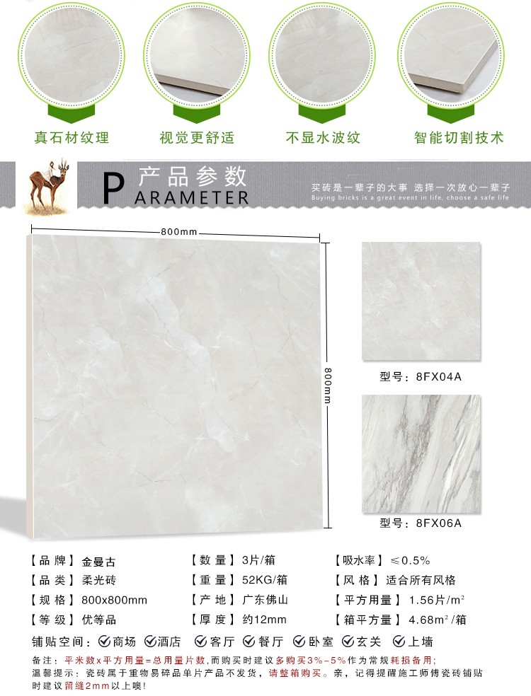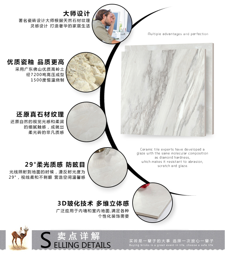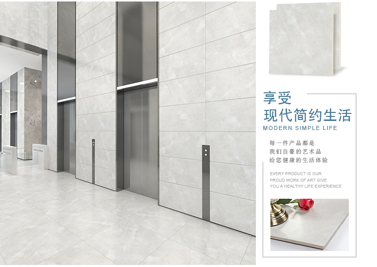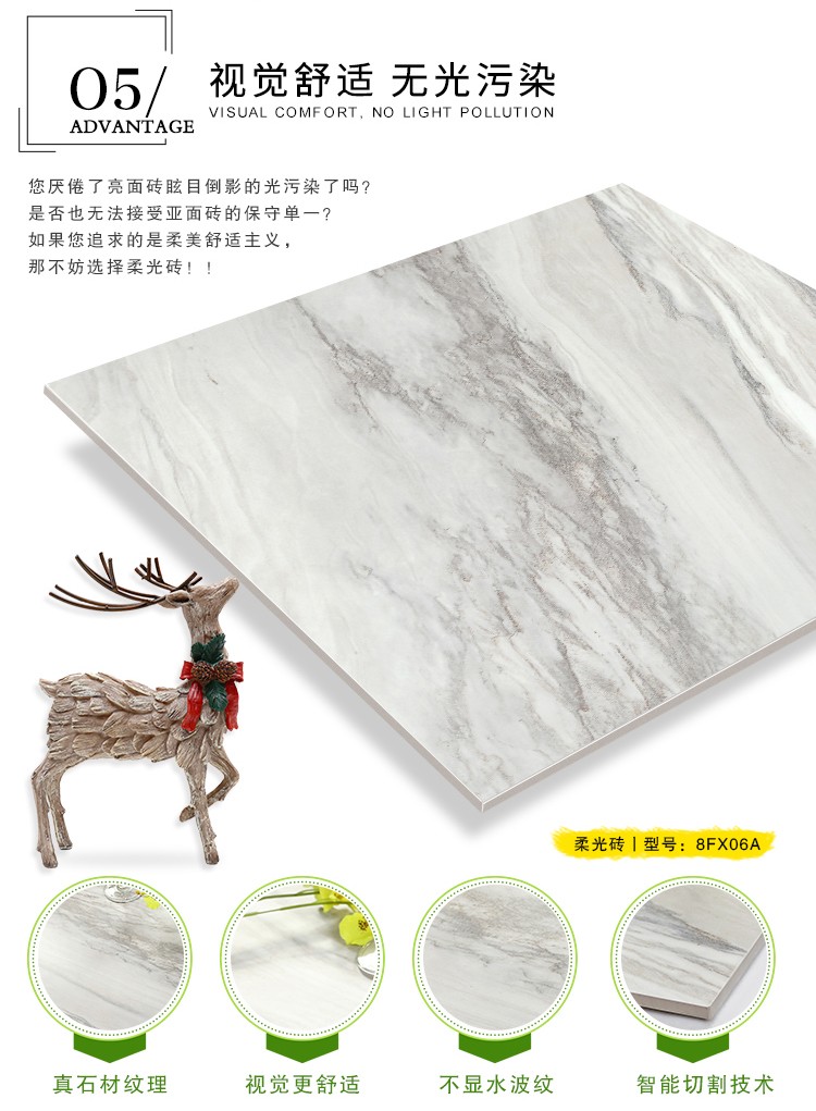柔光瓷磚是磚面反射介于強光與弱光之間的一類瓷磚,其結合亮光類瓷磚的高調明艷裝飾和啞光類瓷磚的低調內斂搭配效果,通過動態柔光蠟拋技術,降低產品反光率,從而達到人體舒適的視覺感受以及無光污染的空間裝飾效果。優點:1.視覺舒適,無光污染 2.堅固耐磨,不易刮花.