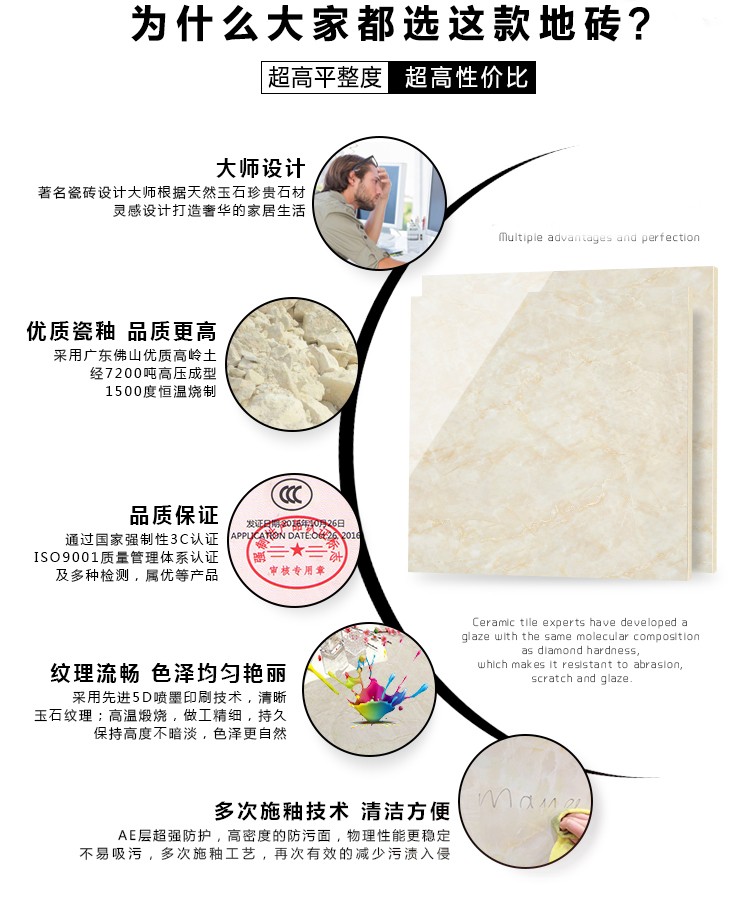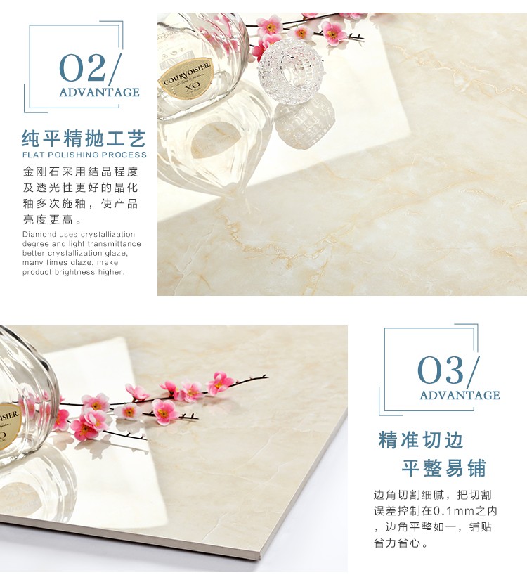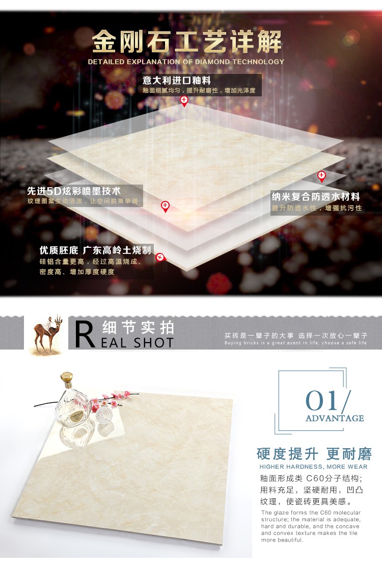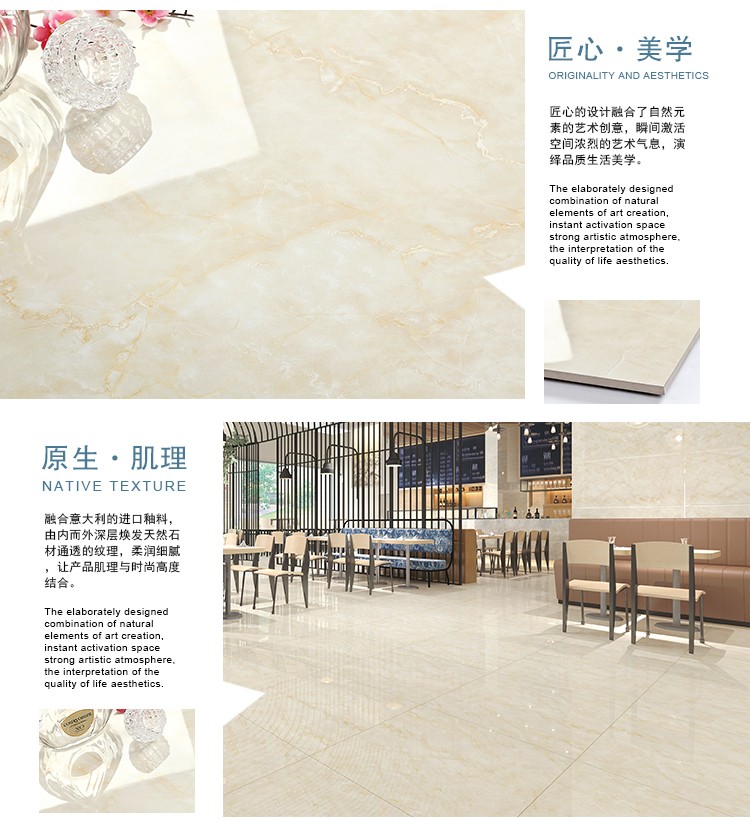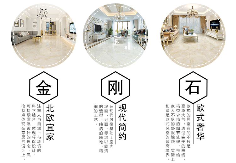金曼古全拋釉瓷磚運用多層特殊制造工藝,將全透析釉料下彩技術(shù)結(jié)合先進印刷工藝,令花紋俯在下層,低碳能源、清潔生產(chǎn),表面光潔剔透,獨有釉料精拋工序,集拋光磚與仿古磚優(yōu)點于一體,釉面如拋光磚般光滑亮潔,同時其釉面花色如仿古磚般圖案豐富,色彩厚重或絢麗。
