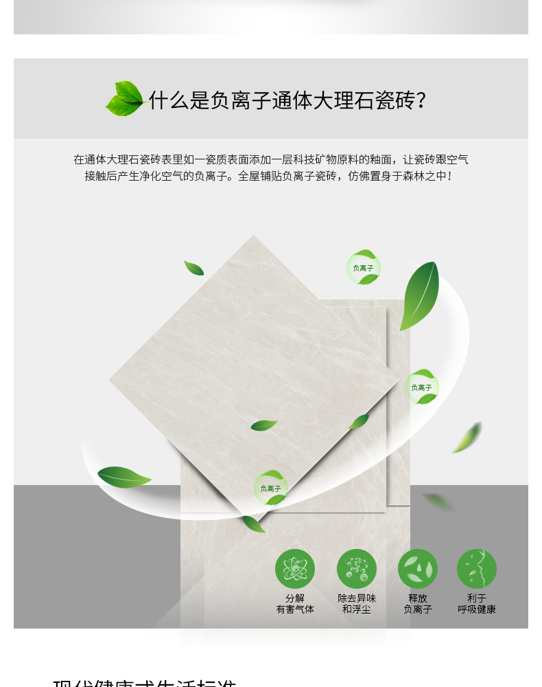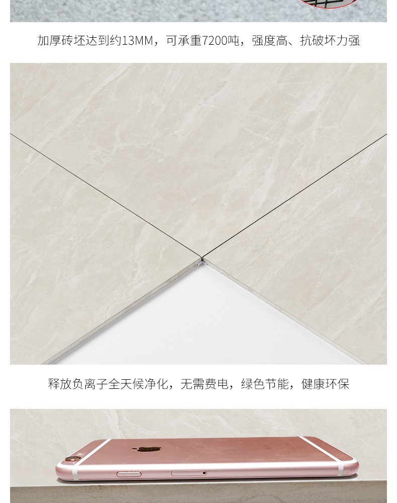 金曼古負離子瓷磚,能持續產生負離子,提高居室內空氣負離子濃度,改善室內空氣質量,提升人體健康水平。負離子被稱為空氣維生素,負離子瓷磚創造安全健康的空間環境。工程用磚全拋釉地磚、通體大理石瓷磚、金剛石地磚等支持加工定做家裝瓷磚批發。
