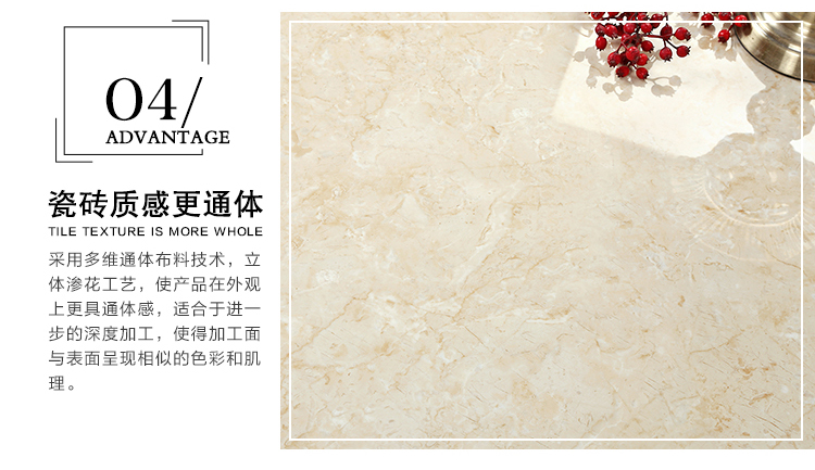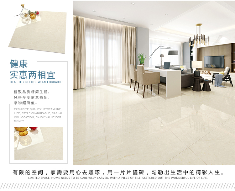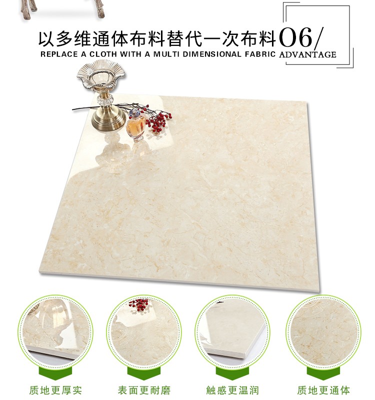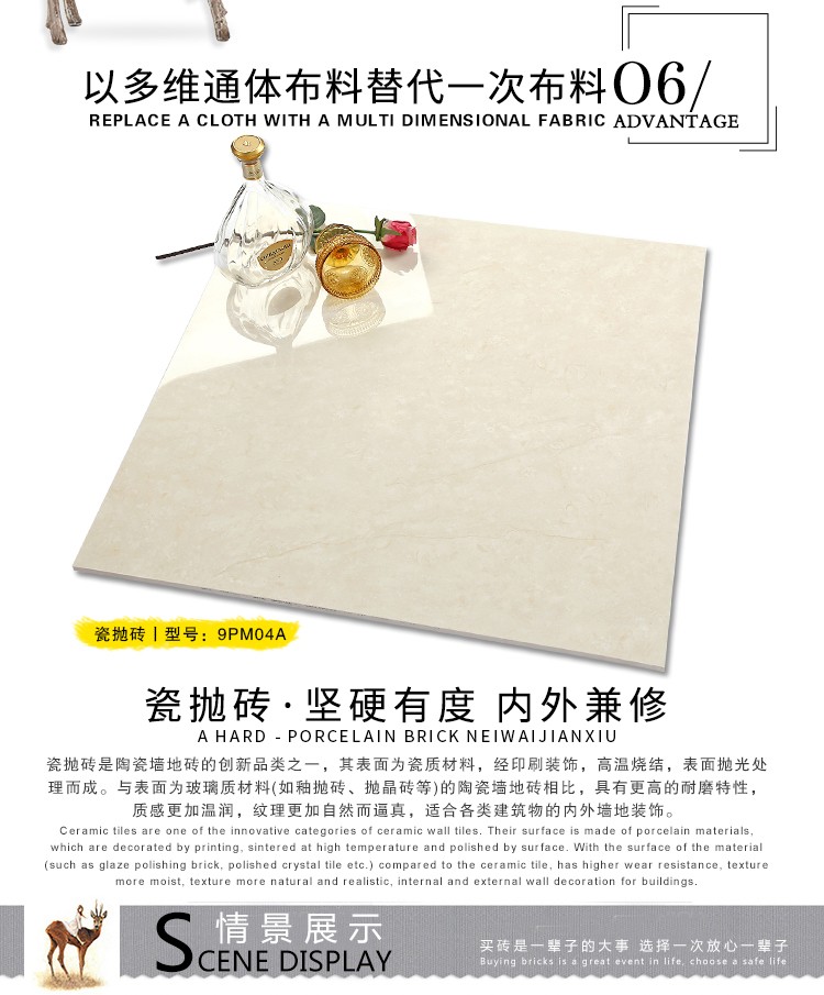 瓷拋磚,是陶瓷墻地磚的創新品類之一,其表面為瓷質材料,經印刷裝飾,高溫燒結,表面拋光處理而成。與表面為玻璃質材料的陶瓷墻地磚相比,具有更高的耐磨特性,質感更加溫潤,紋理更加自然而逼真,適合各類建筑物的內外墻地裝飾。