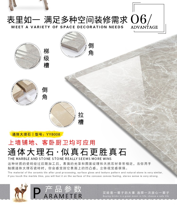 通體大理石瓷磚,即是大理石瓷磚的一種,亦是一種拋釉磚坯經過拋光工序之后形成的瓷磚,只不過通體大理石瓷磚更加注重對瓷磚磚坯的塑造,其原本原理也是在大理石瓷磚基礎上,加類似于瓷磚表面紋理的磚坯組合而成的瓷磚產品。另外,現階段各種傳統單純釉面的大理石瓷磚產品已經開始泛濫,而通體大理石瓷磚的出現無疑又是給已經乏力的大理石瓷磚市場注入新的活力.應用廣,市場大.