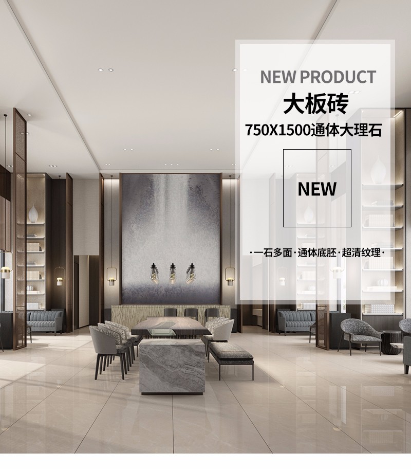 大規格瓷磚(DB751506A)-工程瓷磚 金曼古大規格瓷磚引進世界最先進的超大型壓機自動壓制而成,具有超大規格,超高硬度,超高致密度,超長時間煅燒,超低吸水率,超高光澤度。其磚面紋理流暢自然,效果逼真,適用于大型工程外墻干掛和酒店、商場、各辦公樓大堂等地面裝修