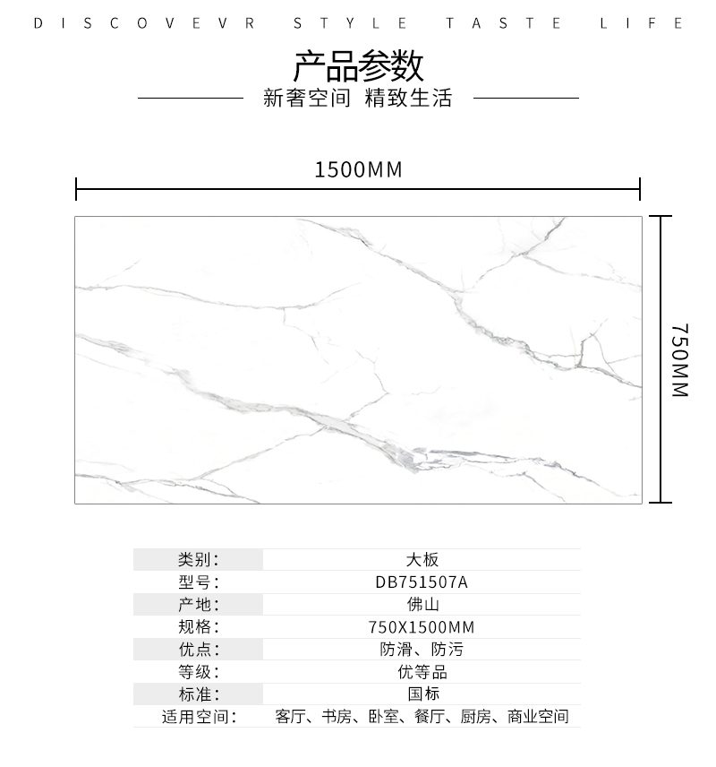 大規格瓷磚(DB751507A)-工程瓷磚 金曼古大規格瓷磚引進世界最先進的超大型壓機自動壓制而成,具有超大規格,超高硬度,超高致密度,超長時間煅燒,超低吸水率,超高光澤度。其磚面紋理流暢自然,效果逼真,適用于大型工程外墻干掛和酒店、商場、各辦公樓大堂等地面裝修